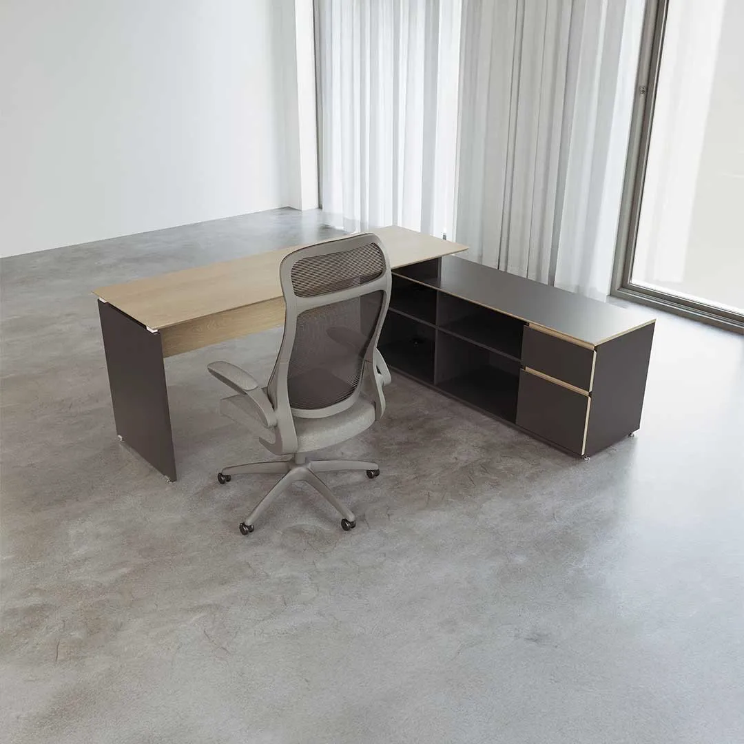 Con un escritorio y credenza integrados, ofrece organización y estilo en melamina de alta calidad. Sus cortes a 45° y combinaciones de colores crean un mobiliario ejecutivo moderno, ideal para destacar profesionalismo sin exceder el presupuesto.